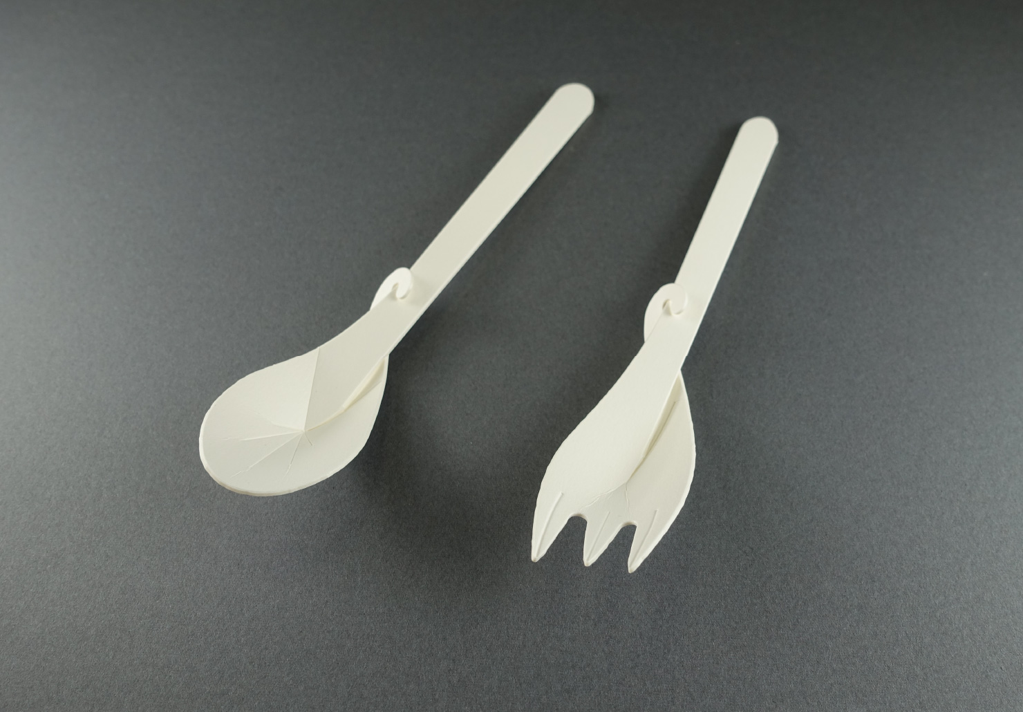 amu(アム)は、独⾃の「ねじり」形状により、⾼強度を実現した環境やさしい紙製カトラリー(スプーン・フォーク)です。